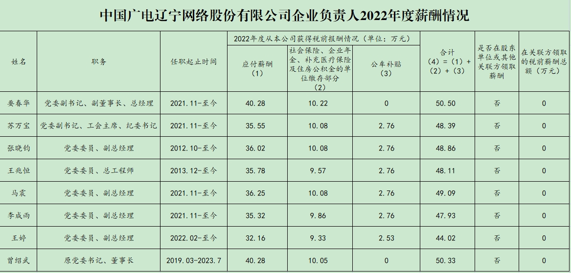 中國廣電遼寧網絡股份有限公司企業負責人2022年度薪酬情況